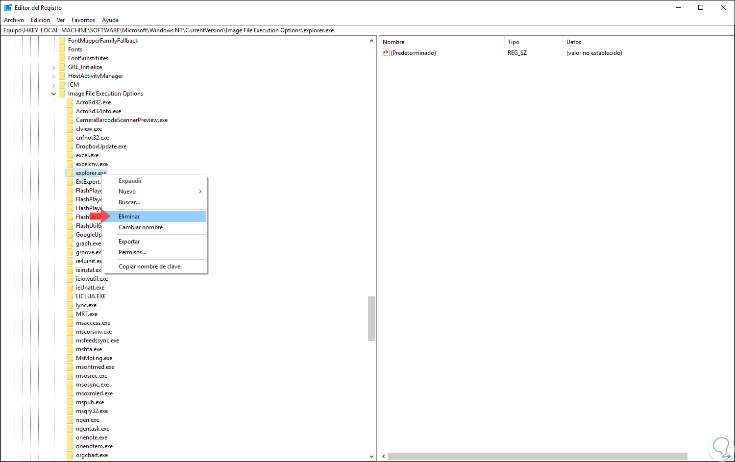 Allí, daremos clic derecho sobre la clave “explorer.exe” y seleccionamos la opción “Eliminar”. Una vez eliminada esta clave reiniciamos el equipo y esta será creada de nuevo de forma automática y con ello podremos corregir los problemas del Explorador.