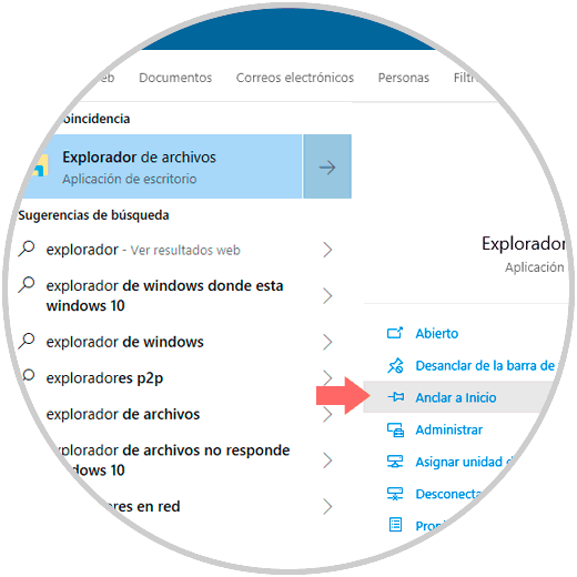 Pero tenemos otro método de acceder de forma simple al Explorador de archivos y es añadiéndolo al menú Inicio, para esto, ingresamos en el cuadro de búsqueda de Windows 10 el termino “Explorador” y en las opciones desplegadas seleccionamos la opción “Anclar a Inicio”, en la nueva versión 1803 de Windows 10 estas opciones serán desplegadas automáticamente.