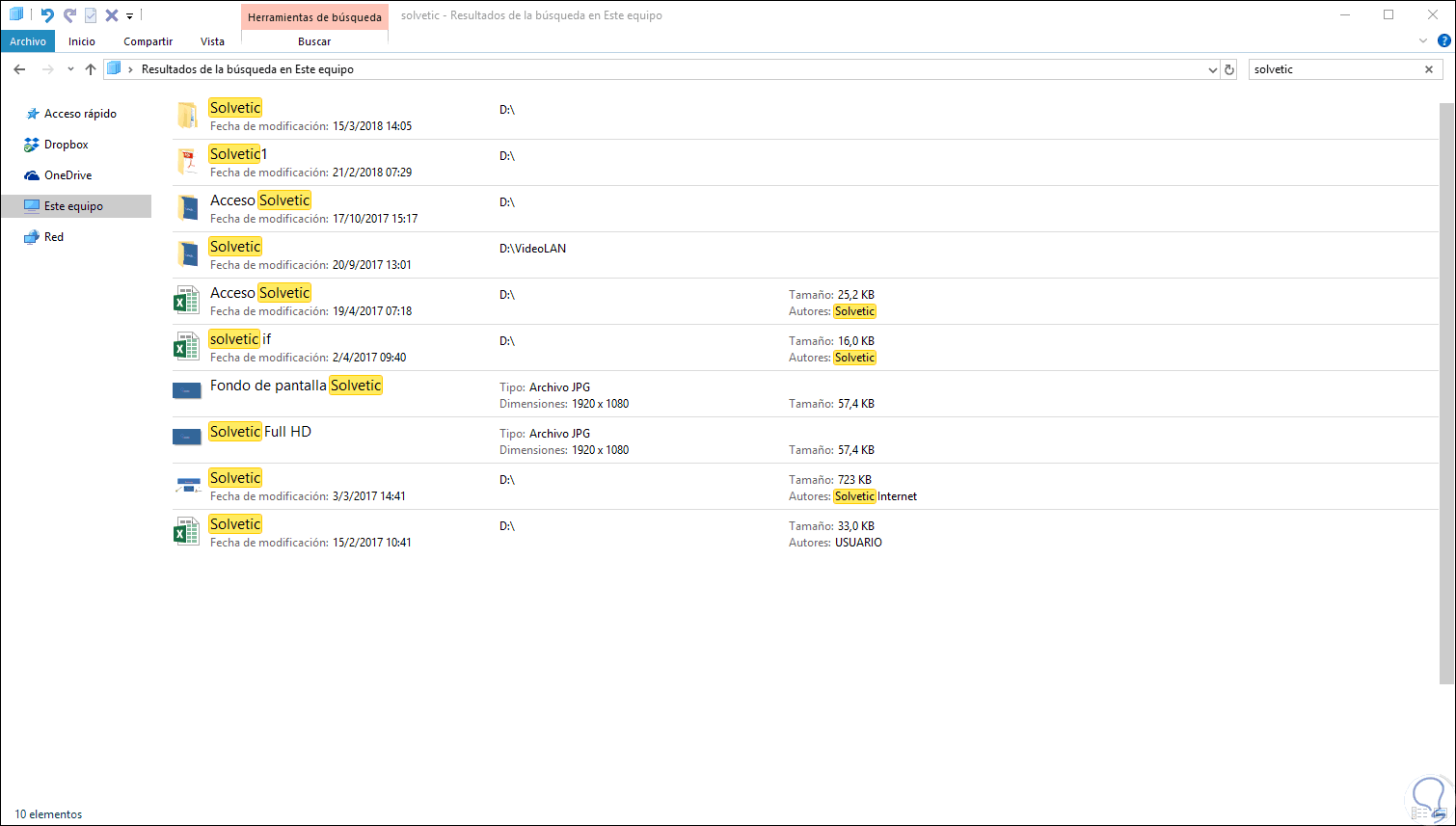 Para realizar una búsqueda en el Explorador de archivos de Windows 10 basta con ingresar el valor a buscar en el cuadro de búsqueda y automáticamente se dará inicio al proceso de búsqueda donde encontramos detalles como: