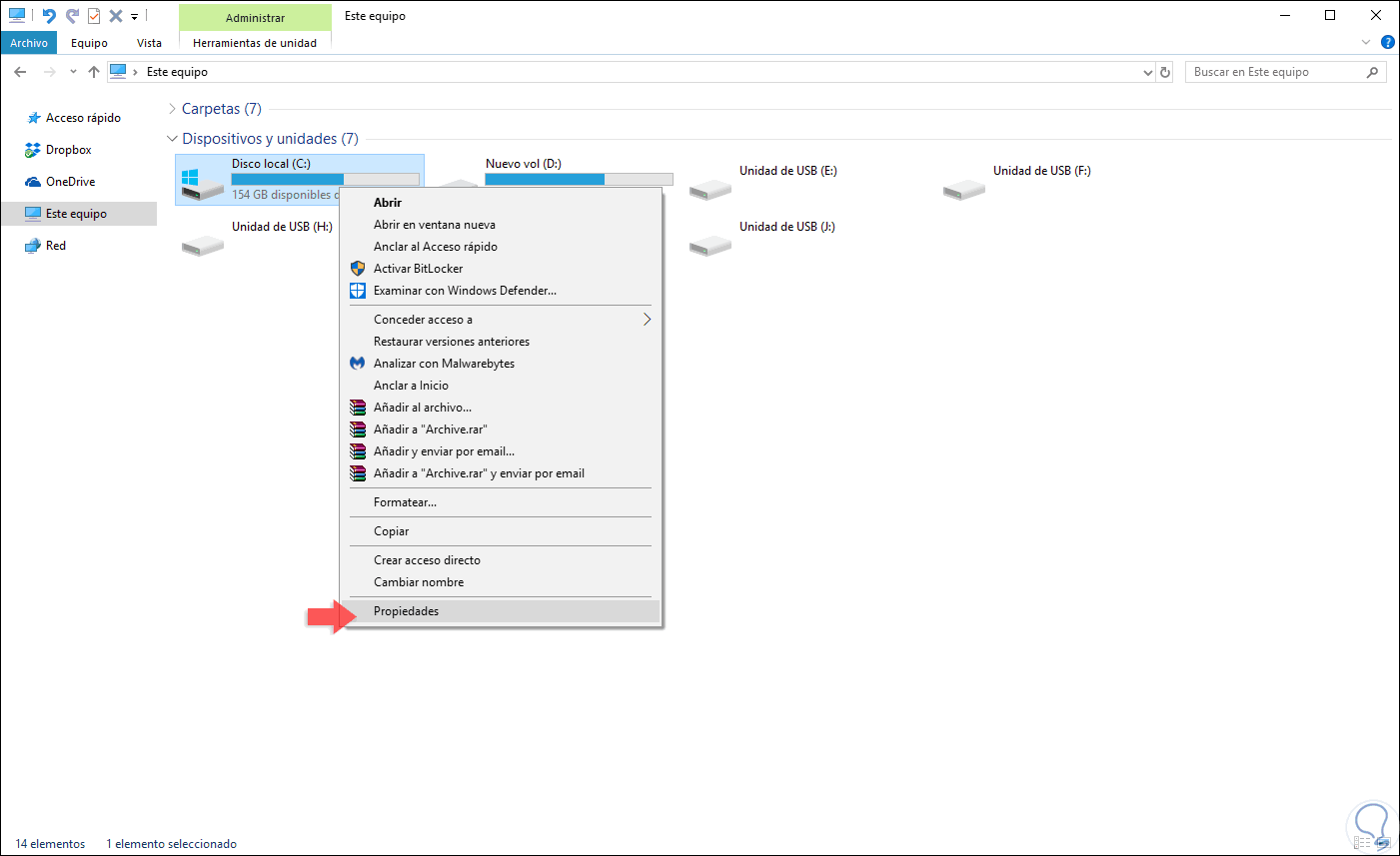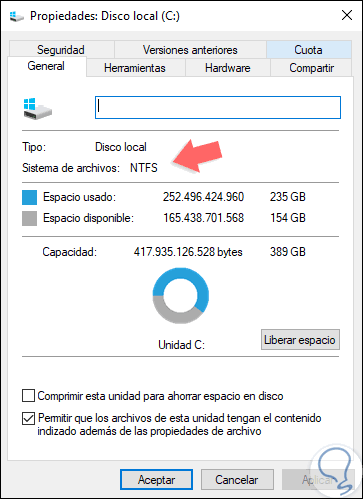 Por ello, antes de usarla, debemos verificar el tipo de sistema de archivos el disco, para ello, daremos clic derecho en la unidad y allí seleccionamos “Propiedades”: