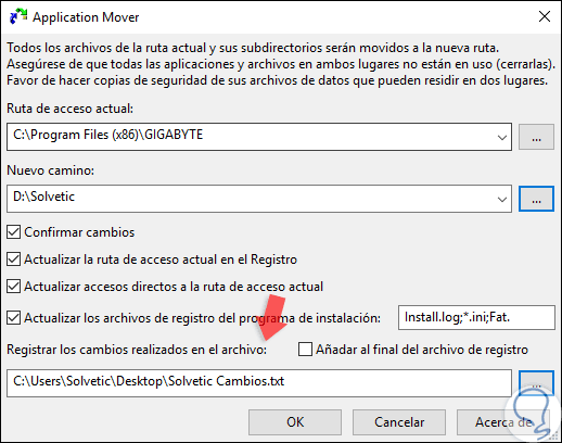 En el campo inferior, “Registrar los cambios realizados en el archivo”, podremos especificar una ruta donde se cuente con un archivo para tareas de gestión sobre las tareas a efectuar. Una vez definido esto, pulsamos en el botón OK para iniciar el proceso de movimiento de la aplicación o juego en Windows 10 y veremos lo siguiente: