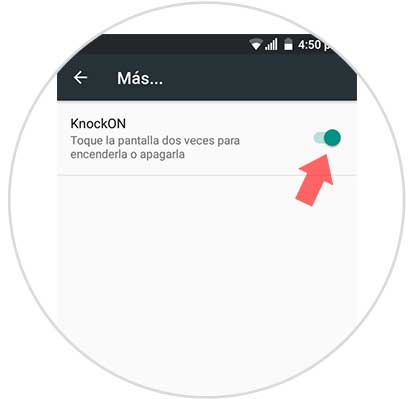 Allí pulsamos en el interruptor para activar KnockOn y para su uso basta con dar dos toques en la pantalla para acceder a su método de desbloqueo seleccionado.