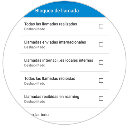 Allí pulsamos en la opción "Bloqueo de llamada" y será desplegada la siguiente ventana donde activaremos las casillas en base al nivel de restricción deseado, desde llamadas locales hasta todas las recibidas: