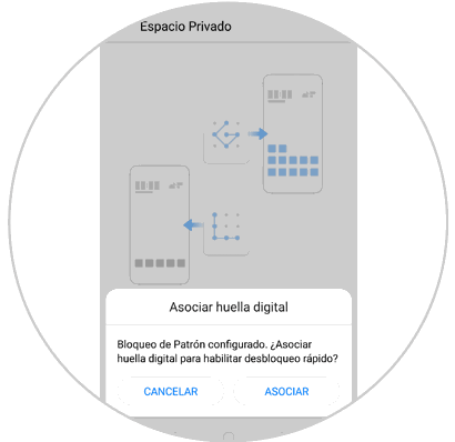 Por último podemos asociar una huella digital con otro dedo para el espacio privado en el caso de que lo consideremos necesario. Pulsa “Asociar” si quieres que tu espacio privado este protegido con huella o “Cancelar” si no es así.