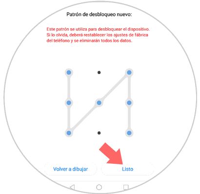 Ahora debemos seleccionar un patrón de desbloqueo en función de patrón que tengamos en nuestro teléfono. (numérico, patrón o contraseña). Repítelo dos veces y pulsa “Listo” para continuar.