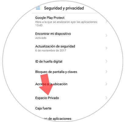 Dentro del menú “Seguridad y privacidad” aparecerá la opción “Espacio privado”. Debemos marcar esta opción para crear nuestro espacio paralelo en el que guardar toda esta info.