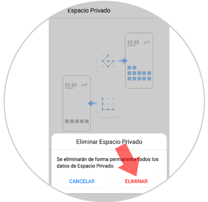 Pulsa sobre él y verás el siguiente mensaje: Pulsando en “Eliminar” habrás borrado definitivamente el espacio privado en tu Huawei.