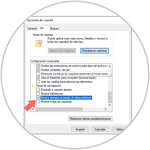 Así, al activar la opción Mostrar siempre estado de disponibilidad, estaremos seguros de desplegar el símbolo de la nube con las carpetas de archivos en el panel de navegación y así contar con mejores opciones de control sobre estas.