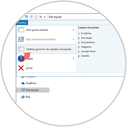 - Ir al menú Archivo y seleccionar la opción Cambiar opciones de carpeta y búsqueda