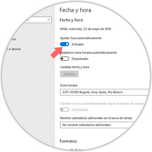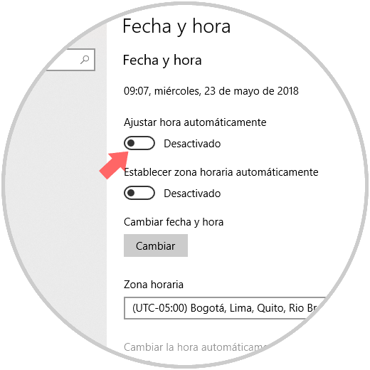 Allí confirmamos que el interruptor Ajustar hora automáticamente sea deshabilitado: