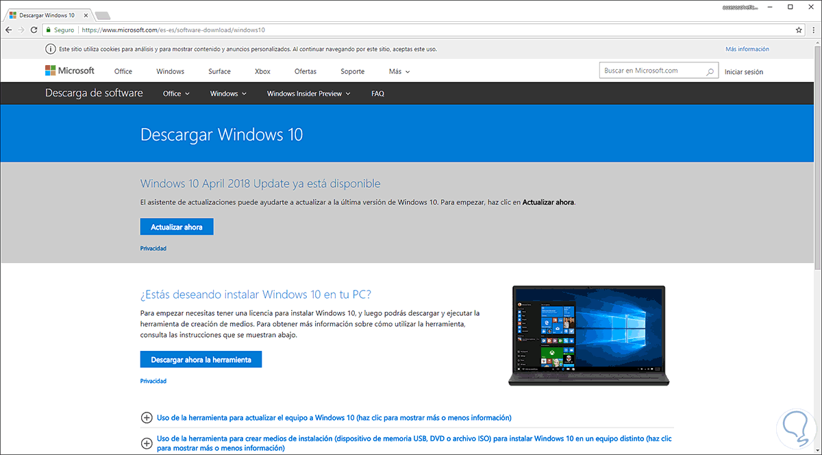 Esta opción nos permite actualizar nuestro sistema operativo directamente desde los servidores de Microsoft, para ello iremos al siguiente enlace: