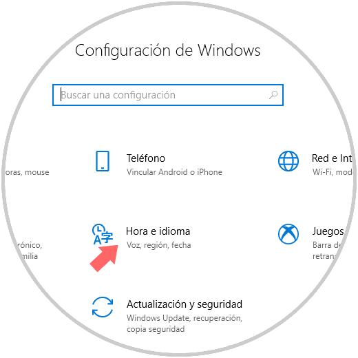 Este primer paso involucra ajustar la hora correcta en Windows 10 y de este modo permitir que la sincronización entre todo el conjunto de servicios del sistema sea correcta, para ello vamos al menú Inicio y allí seleccionamos la utilidad Configuración y veremos lo siguiente: