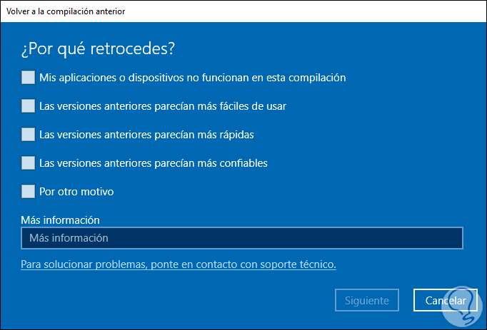 Allí pulsamos en el botón Comenzar ubicado en la sección Volver a la versión anterior de Windows 10 y se iniciara el asistente para dicho proceso donde debemos indicar la razón para ello: