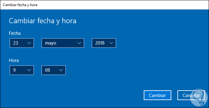 Como vemos se activa el botón Cambiar, pulsamos en el y en la ventana desplegada estableceremos la hora y fecha correctas: