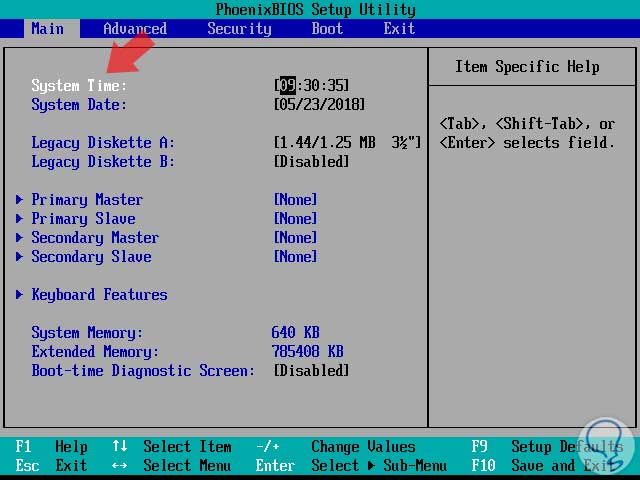 Seleccionamos la hora, minutos y segundos de forma individua y usamos el signo + para aumentar dichos valores o el signo – para reducirlos. El mismo proceso realizamos con la línea System Date si es necesario.