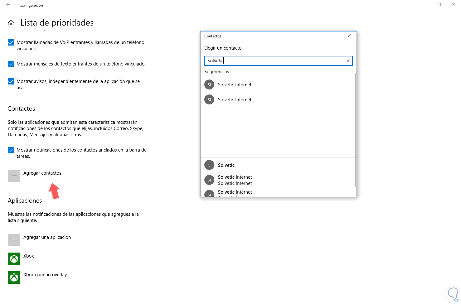 En la sección “Contactos”, podremos recibir notificaciones de los contactos que estén añadidos en esta lista. Solo las aplicaciones admitidas podrán desplegar los mensajes de las personas seleccionadas y esta opción es compatible con aplicaciones como Skype, Mail, Messaging y otras más.