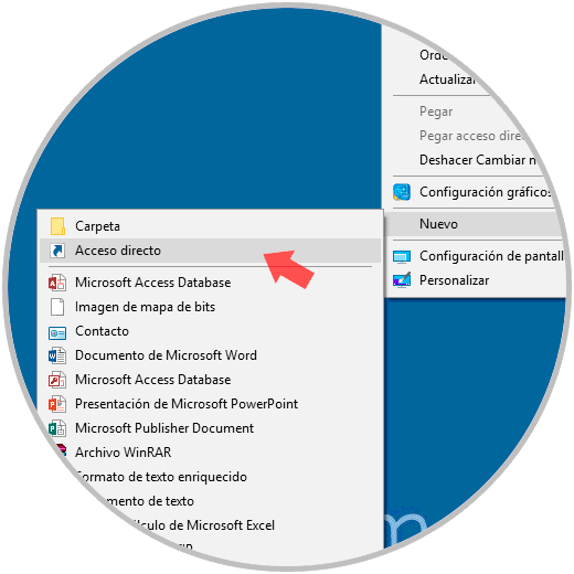 Para iniciar, daremos clic derecho en algún lugar libre del escritorio y seleccionamos la opción “Nuevo / Acceso directo”: