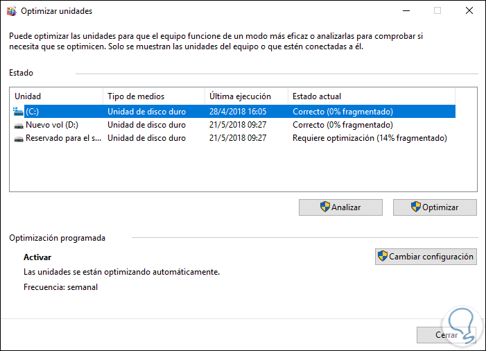 Contar con un disco duro mal optimizado puede reducir la velocidad tanto de navegación como de muchos otros elementos del sistema, por ello Solvetic recomienda realizar de forma periódica el proceso de desfragmentación del disco con el fin de que el propio sistema operativo reajuste todos los sectores con lo cual se mejora el rendimiento del disco duro.