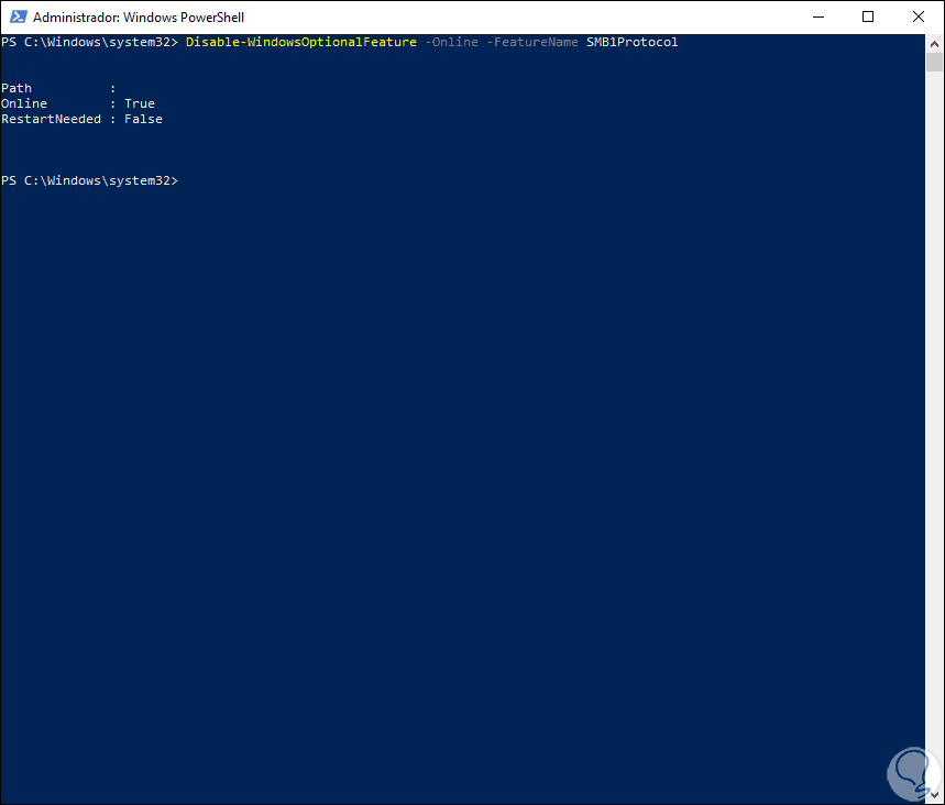 Set-SmbServerConfiguration –EnableSMB2Protocol $trueSi por alguna razón, no recomendable, debemos deshabilitar SMB v2, podemos ejecutar lo siguiente: