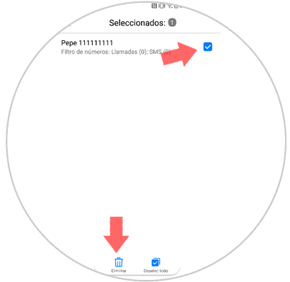 Selecciona el contacto bloqueado que quieres desbloquear pulsando sobre él, y cuando esté seleccionado con un check pulsa en “eliminar” en la parte inferior de la pantalla.
