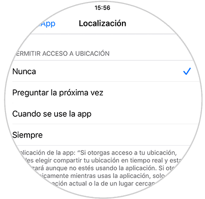 Finalmente pulsar sobre "Nunca" si no quieres que WhatsApp acceda a tu localización o selecciona la opción que te interese.