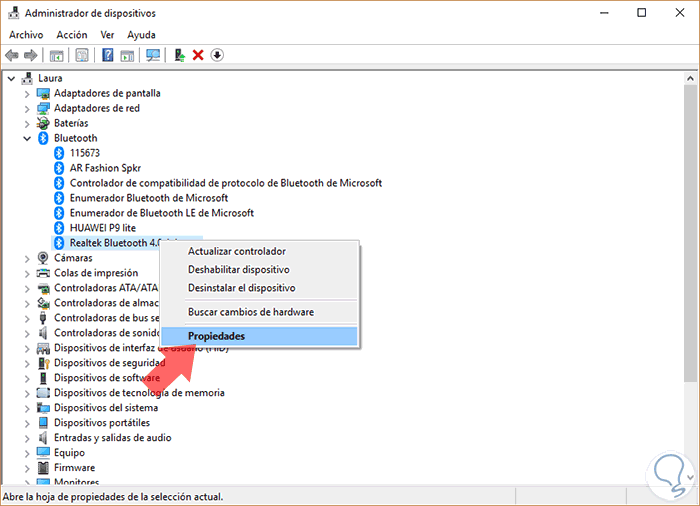 Una vez accedamos al administrador de dispositivos, iremos a la sección Bluetooth y daremos clic derecho sobre nuestro controlador de Bluetooth y seleccionamos la opción Propiedades: