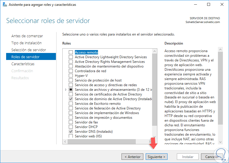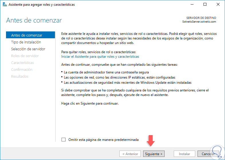 En la siguiente ventana veremos la sección de Roles para el servidor, en este caso no añadiremos ningún rol: