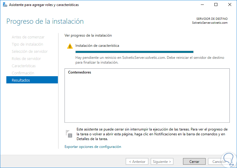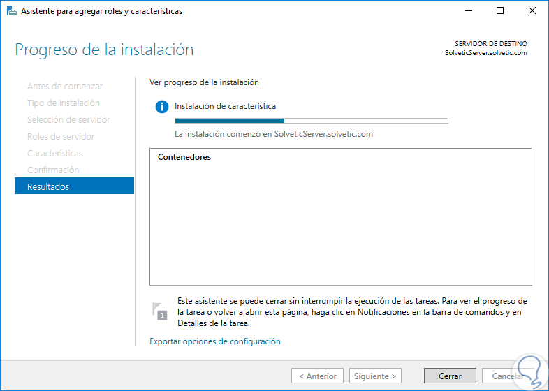 Pulsamos en el botón “Instalar” para dar inicio al proceso de instalación de los contenedores en Windows Server 2019: