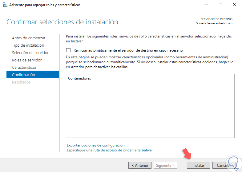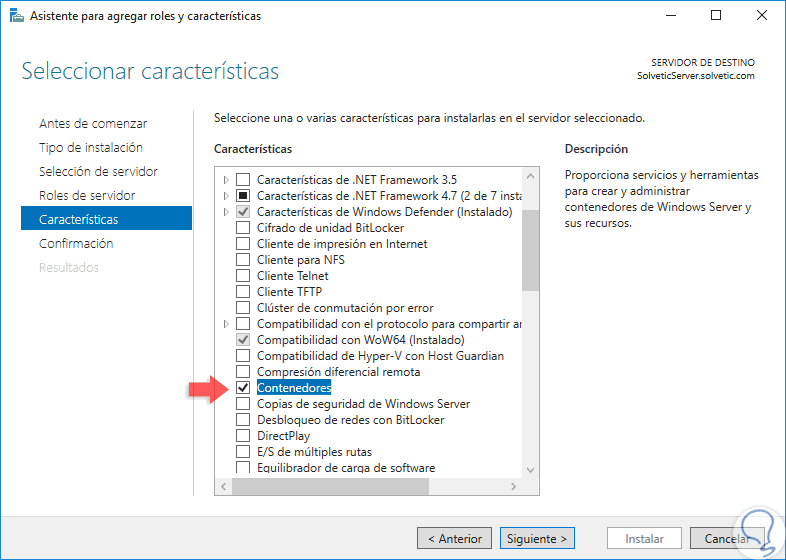 Pulsamos en Siguiente y en la sección Características activamos la casilla “Contenedores”: