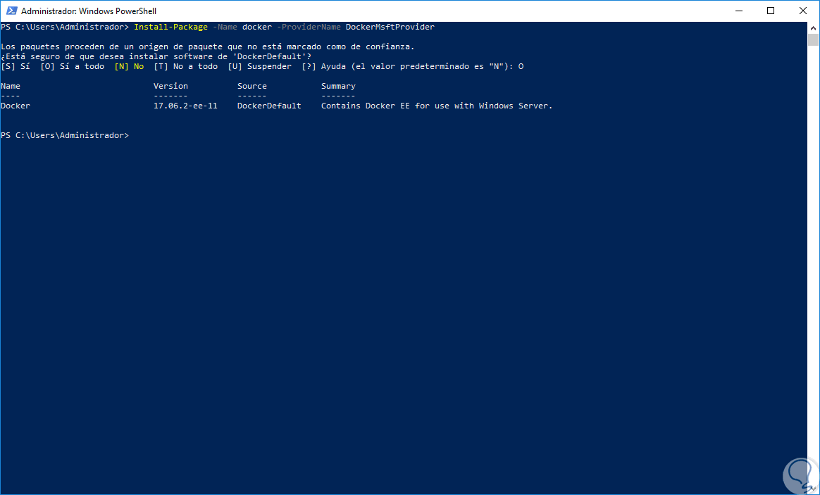 A continuación, vamos a hacer uso del módulo “PackageManagement” de Windows PowerShell con el objetivo de instalar la última versión de Docker, para ello ejecutaremos la siguiente línea: