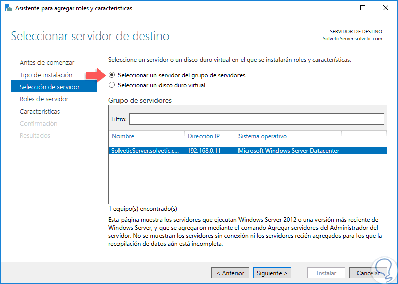 En la próxima ventana seleccionamos el servidor que actuará como host para los contenedores: