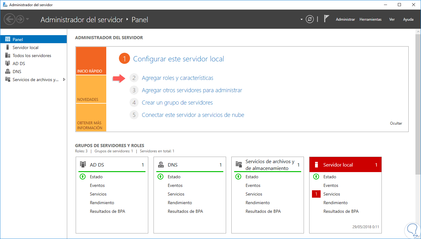 Dando clic en la línea “Agregar roles y características” desde el panel central del Administrador del servidor