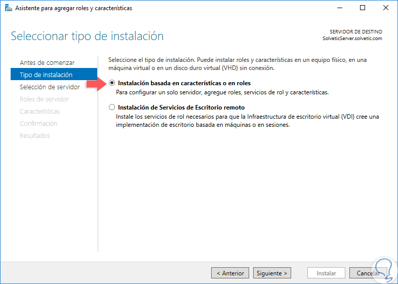 En el encontramos un breve resumen de las actividades que podemos realizar, damos clic en Siguiente y en la próxima ventana seleccionamos la casilla “Instalación basada en características o en roles”: