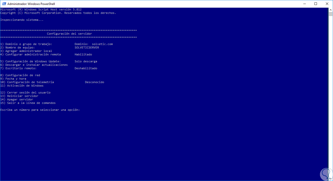 Para un óptimo uso de Docker es ideal actualizar el sistema operativo, aunque el método tradicional es a través de Windows Update, podemos ejecutarlo mucho más rápido usando el comando sconfig ya sea a través del símbolo del sistema o de Windows PowerShell, será desplegado lo siguiente: