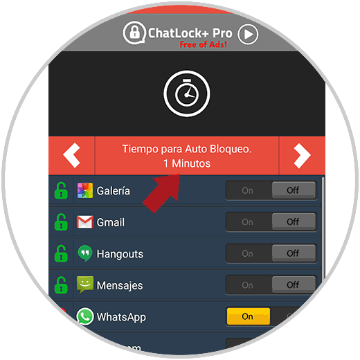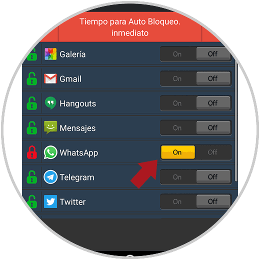 A continuación, veremos el listado de todas las aplicaciones que podemos bloquear con pin. Tornando la pestaña a ON estaremos habilitando la necesidad del uso del código para acceder a ellas.