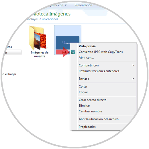 Al descargar e instalar esta utilidad, tendremos la posibilidad de ver la imagen HEIC en alguno de los editores integrados de Windows 7 u 8. Al instalar CopyTrans en Windows 7 u 8, contamos con la posibilidad de convertir dicha imagen dando clic derecho sobre ella y seleccionando la opción Convert to JPEG with CopyTrans: