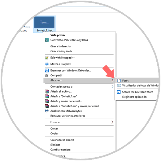 En el caso de Windows, la nueva edición Windows 10 April 2018 cuenta con soporte para abrir imágenes HEIC, para ello basta con dar clic derecho sobre la imagen y seleccionar la opción Abrir con y allí seleccionamos la opción más adecuada: