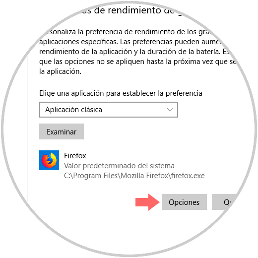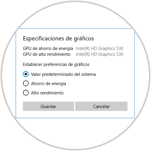 Damos clic en el botón “Opciones” y estas serán las alternativas de uso para la GPU. El valor por defecto es el predeterminado del sistema, pero podemos activar el ahorro de energía o el máximo rendimiento donde se ejecuta un alto consumo de ésta. Allí basta con activar la casilla deseada y pulsar en el botón “Guardar” para aplicar los cambios y de este modo cuando abramos esta aplicación, se usará la especificación que hayamos definido.