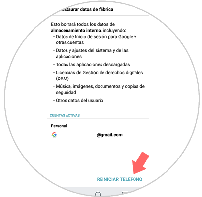 Una nueva pantalla nos va a mostrar la información sobre todos aquellos datos que se van a borrar si realizamos un restablecimiento del teléfono. Si estamos de acuerdo, tenemos que seleccionar en la parte inferior “Reiniciar el teléfono”