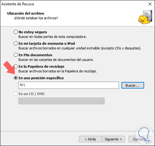 Una vez definido esto, pulsamos en Siguiente y ahora será necesario que indiquemos desde que ubicación fueron borrados los datos, si lo sabemos, en caso de no saberlo activamos la casilla No estoy seguro, pero esto puede tardar un poco mas de tiempo ya que Recuva deberá hacer un proceso mucho más complejo de análisis: