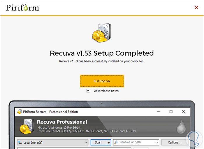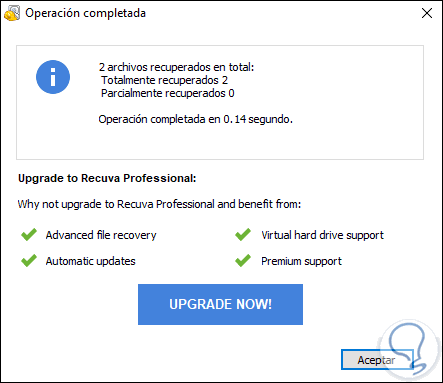 Una vez el proceso finalice veremos lo siguiente. Allí podemos ejecutar directamente Recuva.