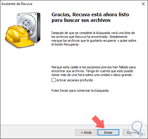 Definido esto pulsamos en Siguiente y será desplegado lo siguiente. Allí podemos, si es necesario, activar la casilla Activar escaneo profundo para que se realice un proceso de búsqueda mucho más extenso.