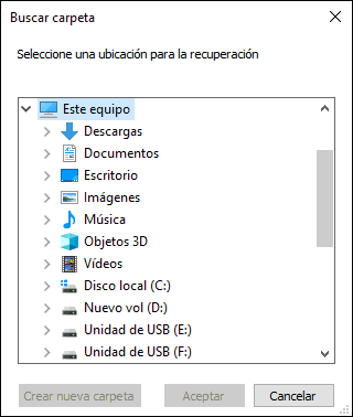 Al pulsar allí se desplegará la siguiente ventana donde definimos la ruta donde se han de recuperar: