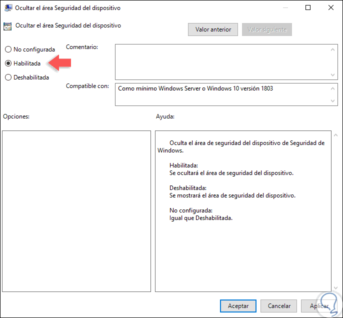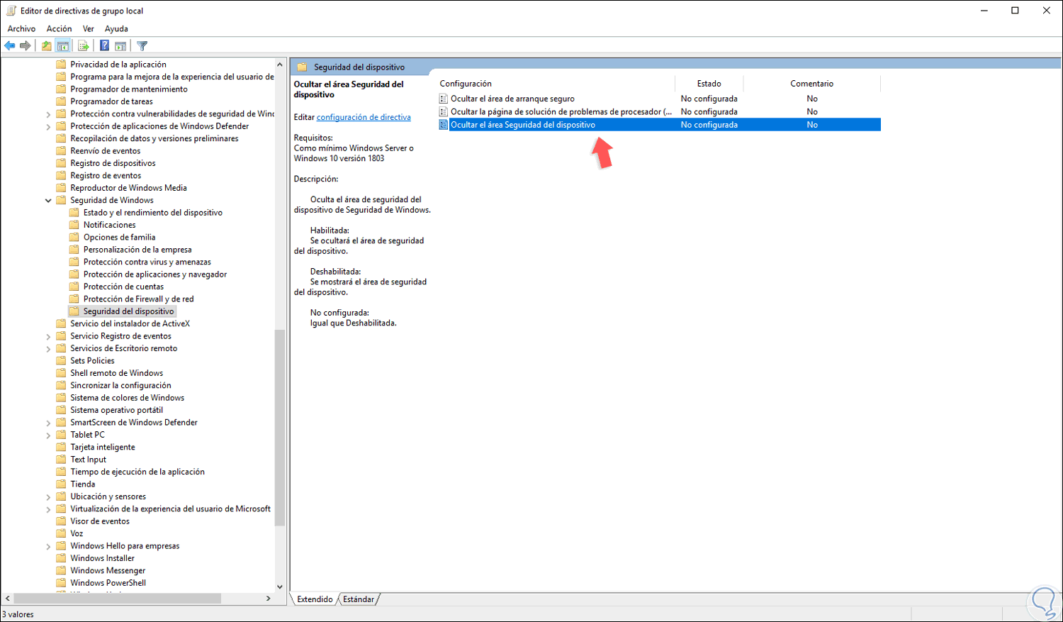 Allí, seleccionamos la política llamada “Ocultar el área Seguridad del dispositivo”: