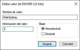 Daremos clic derecho / Modificar o doble clic y en el campo “Información del valor” establecemos el número 1. Con el valor 1 se oculta el icono, el valor 0 lo hace visible de nuevo.