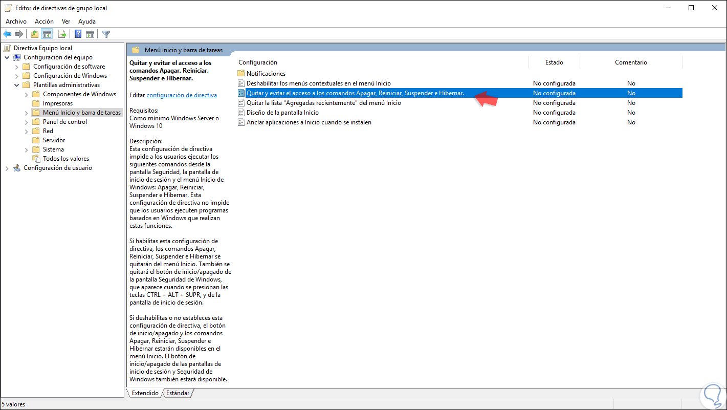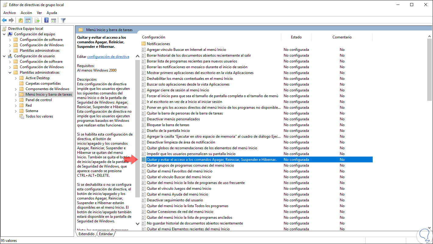 Allí, debemos ubicar la política llamada “Quitar y evitar el acceso a los comandos Apagar, Reiniciar, Suspender e Hibernar”: