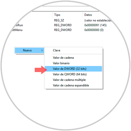 Allí, daremos clic derecho en cualquier lugar en blanco y seleccionamos la opción “Nuevo / Valor de DWORD (32 bits)”: