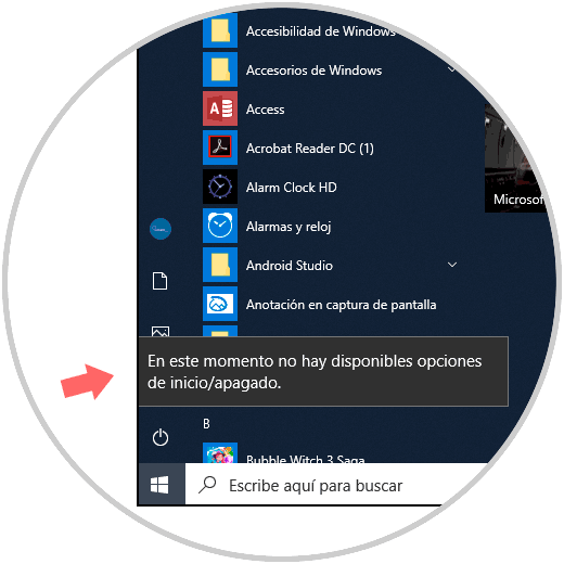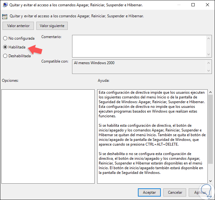 Como vemos, se despliega el mensaje de que no hay opciones disponibles en el sistema. De esta forma podemos establecer una medida de protección para evitar apagados no deseados o no autorizados en el sistema operativo.