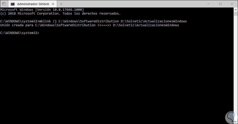 mklink /j C:\Windows\SoftwareDistribution D:\Solvetic\ActualizacionesWindows
