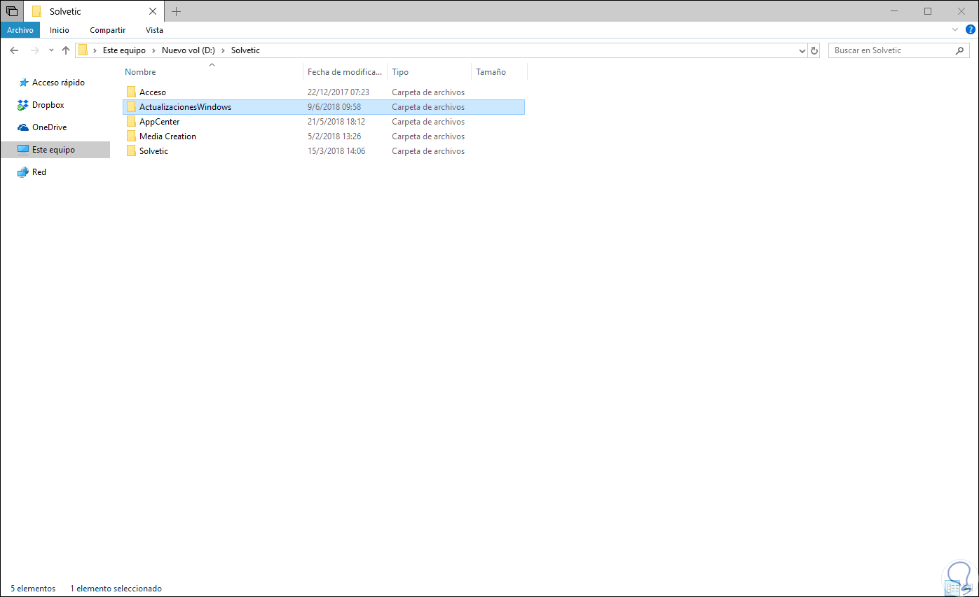 Para este propósito hemos creado una nueva carpeta en la partición D de nuestro Windows 10 y es allí a donde moveremos la carpeta local por defecto donde se alojan las actualizaciones: